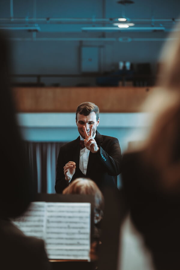 Der schwungvolle Auftritt des Dirigenten Manuel Galemann machte deutlich, dass nun Swing-, Rock- und Pop-Titel angesagt waren. Auch er musste sich gefallen lassen, dass man ihm passend zu dem von ihm arrangierten James-Bond-Melodien einen Martini reichte, natürlich geschüttelt, nicht gerührt. So reihten sich die Musiktitel aneinander, mal mit einem Saxofon-Solo von Micha während des Lady-Gaga-Songs „Die With A Smile“ und zum Schluss mit dem bekannten Winterlied, passend zum Wetter, „Let It Snow“, interpretiert von der Sängerin Ulla, die zuvor schon bei den Bond-Melodien mitgewirkt hatte. Stefan, der Mann für special effects, hatte es sich nicht nehmen lassen, dazu einen beleuchteten Schneemann auf der Bühne zu präsentieren. Da wurde es den Bläserinnen und Bläsern auf den hinteren Stehplätzen plötzlich so kalt, dass sie ihre Pudelmützen aufsetzen mussten.